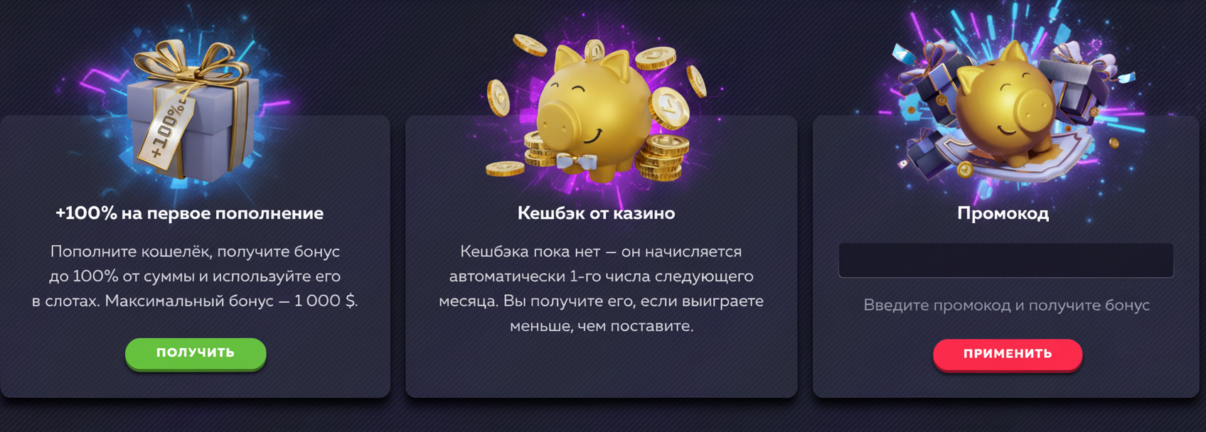 Депозитный бонус — 100% к первому пополнению счета. Минимальный депозит — 1 $, максимальный — 1000 $. Полученные средства можно использовать в любых слотах, а для вывода необходимо выполнить условия отыгрыша с вейджером х35.